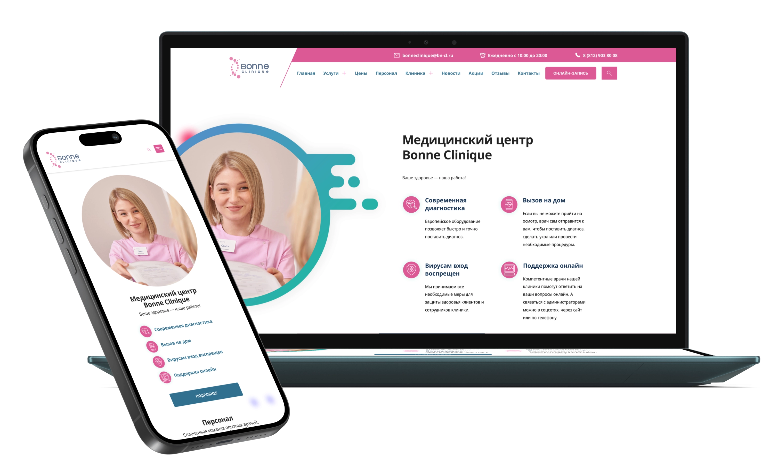 При создании визуальной составляющей сайта мы сделали упор на минимализм, чтобы сосредоточить пользователя на УТП. При разработке структктуры мы постарались сделать путь пользователя от перехода на сайт до отправки заявки максимально беспрепятственным, интуитивным и быстрым. В хедер добавили кнопку для онлайн-записи, а также подключили модуль для записи через сайт